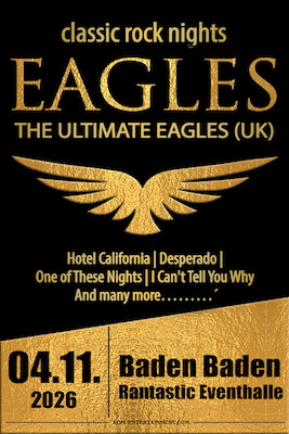 Die Band "Ultimate Eagles" präsentieren die Songs der Eagles aus jedem Album und jeder Epoche. Ein absolutes Muss für Liebhaber der Musik der Eagles. Zu erleben gibt es einen Abend mit der umfassendsten und genauesten Hommage an die Eagles und deren Hits „Hotel California“, „Lyin‘ Eyes“, „One Of These Nights“, „Take It To The Limit“, „Desperado“, „Take It Easy“ und vielen weiteren.