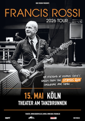Auf der ‘An Evening of Francis Rossi’s Songs from the Status Quo Songbook and more...’-Tour wird die lebende Rock-Legende jedenfalls noch einmal viele seiner typischen Hits spielen, die Quo berühmt gemacht haben. Dazu präsentiert Francis einige seiner persönlichen Lieblingssongs, und erzählt spannende Geschichten aus seinem unglaublichen Leben im Musikzirkus.