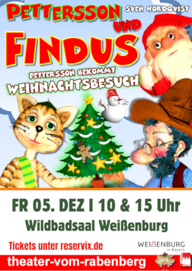 Weihnachten steht vor der Tür. Und der der kleine Kater Findus wünscht sich nichts sehnlicher als dass der Weihnachtsmann ihn besuchen kommt. Aber der Weihnachtsmann besucht ja eigentlich nur Menschenkinder - und keine Katzen. Als sich der alte Pettersson dann, am Tag vor dem heiligen Abend auch noch den Fuß verstaucht, ist eines klar - das wird das schlimmste Weihnachten das Findus jemals erlebt hat! Wie am Ende doch noch alles gut wird, zeigt das „Theater-Rabenberg“ in einem lustigen Stab-Marionetten-Spiel, nicht nur für Kinder!