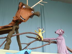 „Löwe und Maus“ basiert auf der gleichnamigen Fabel von Aesop. Auf der Bühne ein Sofa und Zimmerpflanzen, dann der Klang einer Buschtrommel, die Schatten einer Elefantenherde ziehen vorbei und schon fühlen sich die Kinder mitten in der Steppe Afrikas. Eine Geschichte darüber, dass die Großen manchmal eine kleine Hilfe brauchen und die Kleinen Mut beweisen und Großes vollbringen können… Das Theaterstück ist eine abwechslungsreiche Mischung aus Schauspiel, Masken- und Schattenspiel.