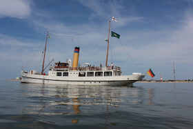 Wir laden Sie ein zu einem Rundgang über das Schiff. Schauen Sie sich gerne das historische Ruderhaus mit dem riesigen Steuerrad und den beiden Maschinentelegraphen an. Werfen Sie auch einen Blick in den Maschinenraum, wo die beiden Dampfmaschinen von den Maschinisten bedient werden. Wie in früheren Zeiten zieht das Schiff gemütlich an Eemshaven vorbei, bis kurz darauf die Insel Borkum in Sicht kommt. Bald darauf drehen Sie ein in die sogenannte Fischerbalje und das Einlaufmanöver in den Borkumer Schutzhafen beginnt.