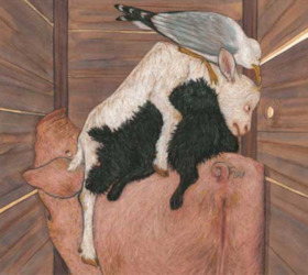 Was für ein Glück, dass hier am Strand keiner Angst hat. Vor gar nichts. Höchstens vor Meerungeheuern. Und vor diesem Geräusch, das plötzlich zu hören ist. Da ist es in der Kiste sicherer. Oder vielleicht doch nicht? Eine Ziege, ein Hund, eine Möwe und die Sau Rosine verstecken sich in der Kiste.