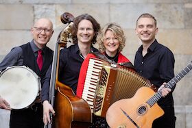Mit dem extravagant-spielwitzigen Akkordeonisten Andreas Hinterseher und dem durch verschwenderischen Ideenreichtum glänzenden Pianisten Chris Gall leben sie ihre Musik im Hier und Jetzt. Dies erinnert an vier Burschen, die fröhlich musizierend über die südlichen Stadtplätze und Jahrmärkte zogen. So geschehen in den Anfängen von Quadro Nuevo.