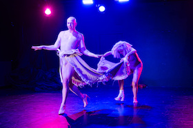 In Unsex Me Here trans femmes meet sages-femmes, the perimenopausal become seriously regal bitches, and voiceless queens make themselves heard in a kaleidoscope of ritual acts of feminist solidarity. In a dance and drag performance, Maria F. Scaroni and Olympia Bukkakis explore the figures of the Queen and the Witch, both in the Western historical imagination and in the queer and now. For this piece they take these often humorously ascribed titles seriously, exploring what it means to be a monarch, healer, drag queen, crone, trans femme and (peri)menopausal woman; what it means to be childless and yet fruitful. To refuse reproduction, but still multiply.