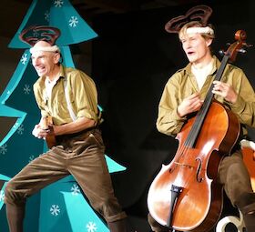 Wenn die ganz Kleinen vor Freude glucksen, lauthals lachen, mitsingen und gespannt lauschen, dann stehen womöglich zwei Rentiere auf der Bühne. Hannes und Peter, so heißen die beiden Rentiere, haben sich warme Mützen aufgesetzt und in kuschelige Schals gewickelt, denn der Winter ist kalt. Weihnachten steht vor der Türe. Und der Weihnachtsmann lässt auch dieses Jahr wieder auf sich warten. Das kennen die beiden schon. Ihr Mittel gegen die Langeweile in der Wartezeit: sich gegenseitig foppen, Lieder singen, dem Winter lauschen und den Klang der fünften Jahreszeit erforschen. Dabei erzählen die beiden Rentiere von ihrer ganz eigenen Sicht auf Weihnachten. Mit Ukulele, Cello und mit ganz vielen Geschichten im Gepäck.