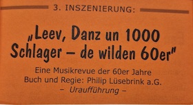 Die Spieler und unsere Live-Band nehmen Sie mit auf eine Reise durch die Zeit von Woodstock, der Anti-Babypille, den Beatles und der Mondlandung. Erinnert wird daneben auch an den Bau der Mauer, der Ermordung von John F. Kennedy, der Erfindung des Farbfernsehens, „Elternschock“ Minirock, Afrika-Cola sowie den Modetänzen Loco-Motion und Letkiss. Hören Sie neben vielen anderen musikalischen Nummern z.B. „Die Liebe ist ein seltsames Spiel“, „Merci Cherie“ oder „Ich will ´nen Cowboy als Mann“
