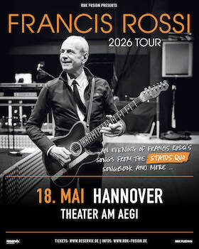 Auf der ‘An Evening of Francis Rossi’s Songs from the Status Quo Songbook and more...’-Tour wird die lebende Rock-Legende jedenfalls noch einmal viele seiner typischen Hits spielen, die Quo berühmt gemacht haben. Dazu präsentiert Francis einige seiner persönlichen Lieblingssongs, und erzählt spannende Geschichten aus seinem unglaublichen Leben im Musikzirkus.