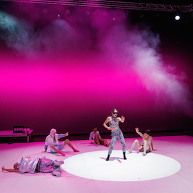 Die Ouinchs – kleine, schelmische Feen – laden ein zu einer ambivalenten, ausschweifenden Tanzperformance an der Schnittstelle zwischen „traditionellem“ Volkstanz und zeitgenössischem Tanzstil der Clubszene. Auf die treibenden Beats von Dj Mulah entsteht eine utopische, universelle Tanzform, bei der der gesamte Bühnenraum zu einem Ort festlicher, zeitgenössischer und inklusiver Rituale wird und in einem großen Karneval und queeren Fest gipfelt.