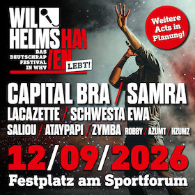Wilhelmshaven, 25. November 2025 – Das Warten hat ein Ende: Am 12. September 2026 wird Wilhelmshaven zum Zentrum der deutschen Rap-Szene, wenn das mit Spannung erwartete WILHELMSHAVEN LEBT! – DAS DEUTSCHRAP FESTIVAL IN WHV! auf dem Festplatz am Sportforum stattfindet. Mit Capital Bra und Samra als Headlinern verspricht das Festival ein unvergessliches Event für alle Deutschrap-Fans. Doch das ist noch nicht alles: Auch Acts wie Lacaeztte, Schwesta Ewa, Saliou, Zymba, Ataypapi sowie lokale Größen wie HzumZ, AzumT und Robby werden für ordentlich Stimmung sorgen. Und es wird noch mehr spannende Acts geben – wir halten euch auf dem Laufenden!