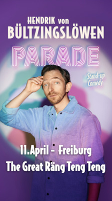 Vorhang auf für Hendrik von Bültzingslöwen: Er ist Comedian, Schauspieler und laut Hörzu „Kult im Internet“. In seinem Soloprogramm geht es um adlige Familientage, Topfkäufe bei Karstadt und den Traum, einmal im Tatort die Leiche zu spielen. In „Parade“ präsentiert er mit amüsantem Witz und herrlicher Finesse das Merkwürdige im scheinbar Normalen. Dabei sind die Blickwinkel grandios, die Gags exzellent und die Pointen perfekt. Fragt sich nur: Wie ist das Timing? Vorsicht,