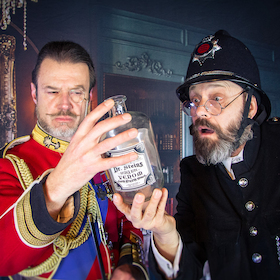 Neu im Programm: Es gibt jetzt eine Menge handgemachte Musik im „Comedy Krimi Dinner“, die die beiden Multitalente gekonnt in die Handlung mit einbauen. Schließlich sollen die Gäste bekommen was sie verdienen: