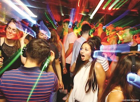 Am Einlass erhältst du einen speziellen "LED NEON Lights" Funk-Kopfhörer und wählst per Schalter den Kanal, den du hören willst. Schon gehts los, denn Du bist mitten in der Party und entscheidest, wie laut du die Musik hören willst. Diese "silent" Party ist genauso bunt wie verrückt. Im Hintergrund ist es unterdessen nämlich wirklich leise, das heißt für Dich: Kopfhörer auf = Party On, Kopfhörer ab = Party Off. Du hast die freie Wahl!